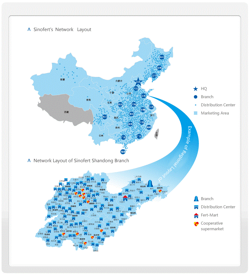 This network is composed of 17 branches, more than 2100 distribution centers and 180-plus cooperative stores. We are also exploring the mode of direct-sale retail. The distribution network spreads over all inland provinces except Tibet, covering 95% arable land of China.