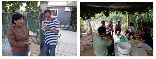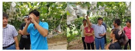 3 第三個階段——科技培訓與自我宣傳 培養科技農民,是實現農業可持續發展非常重要的方式,也是宣傳自身非常重要的手段。入駐小院以來,通過專家進園指導、農業科技知識大講堂、科技圍墻、集市擺攤坐診等形式,在解決農民生產實際問題及傳播農業科技知識的同時,也在逐漸擴大我們在村里的知名度和影響力。 3.1 專家進園指導 入駐小院正值尹家村葡萄收獲時節,農戶葡萄管理中的問題也暴露出來,針對調研中發現的主要問題,邀請王寶杰老師及平度市果樹站專家進園指導,答疑葡萄水罐子病、霜霉病、卷葉病毒病、灰霉病、綿蚜等病癥,并給出了相應解決方法,同時給村書記尹行大果園葡萄測定了糖度。